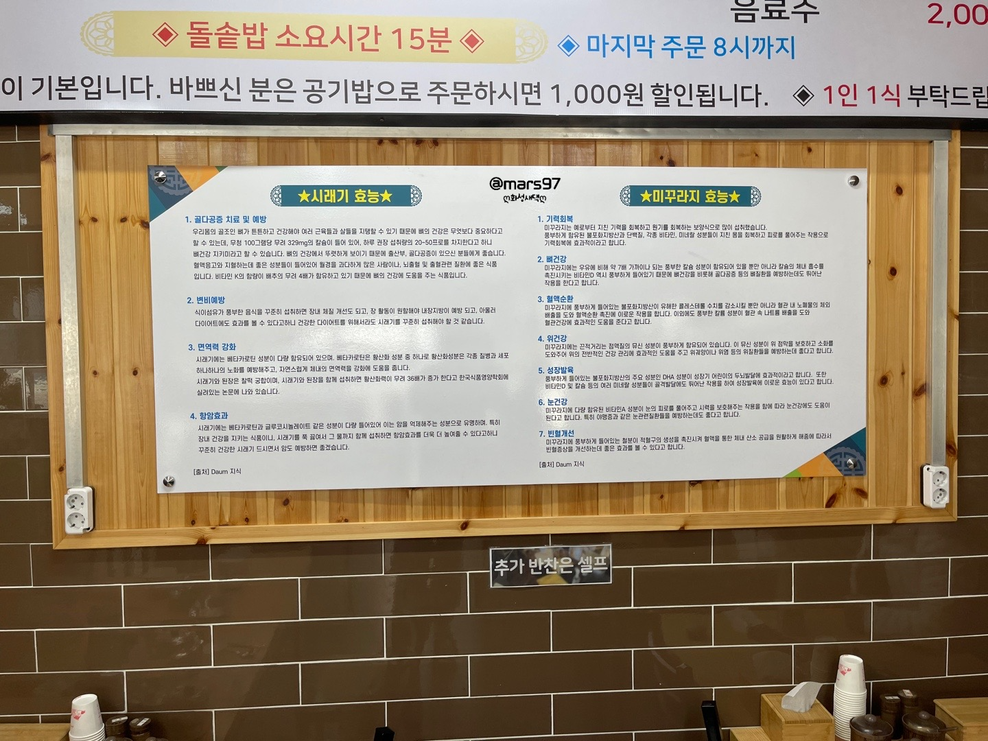 한쪽 벽에 시래기의 효능과 미꾸라지의 효능이 쓰여 있어요