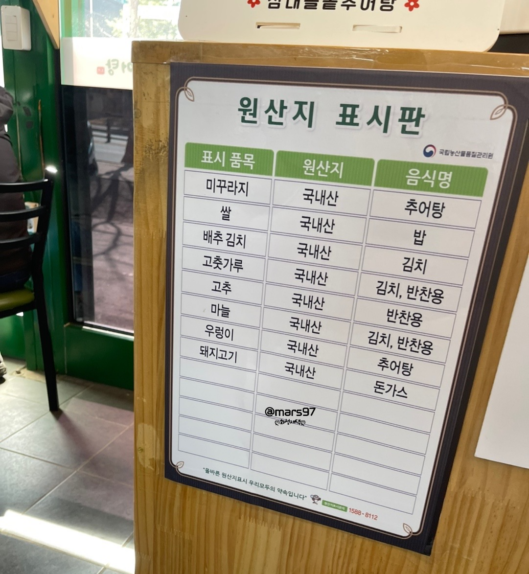 이천 삼대 돌솥 추어탕은 모든 재료가 국내산이예요