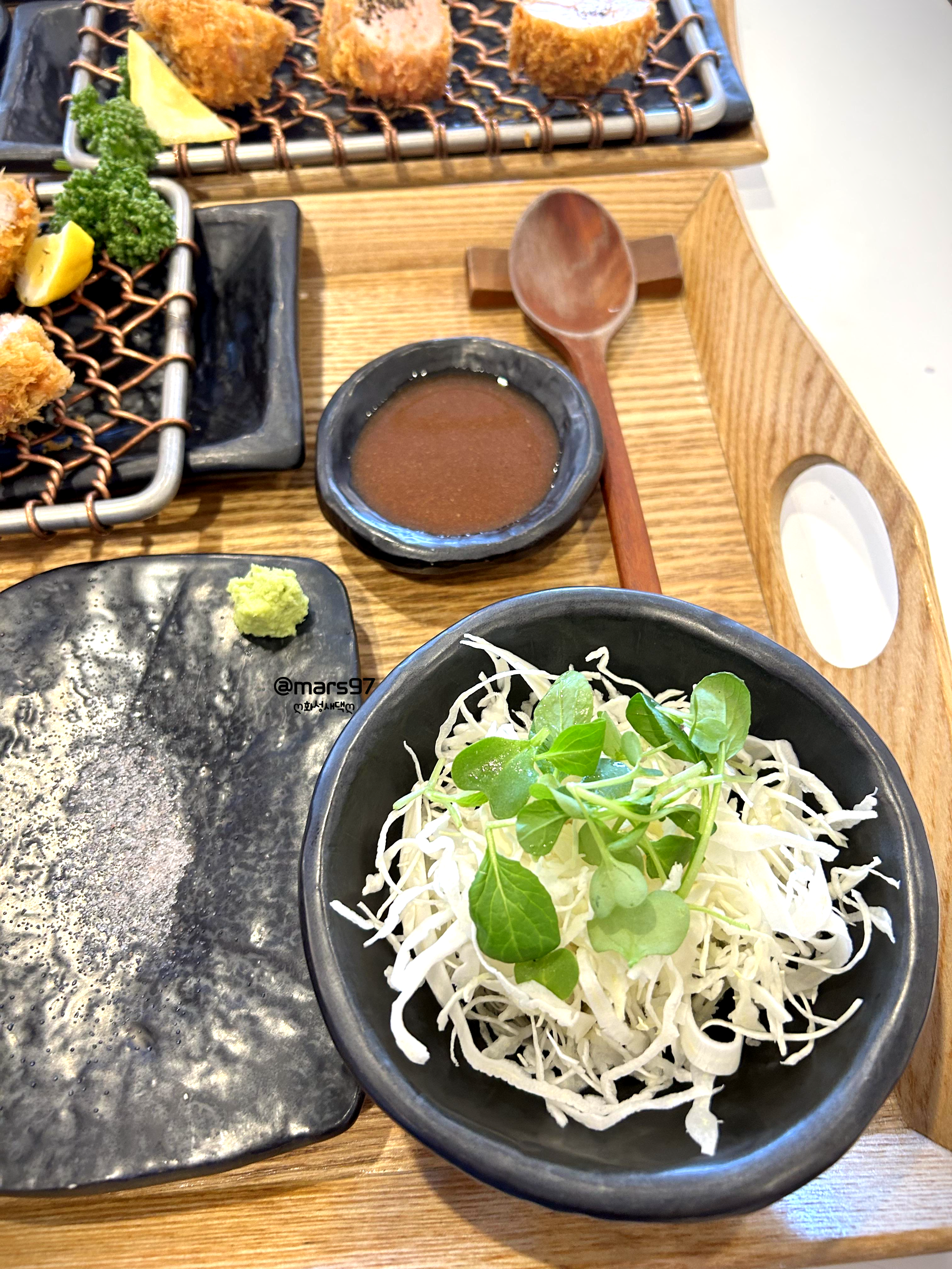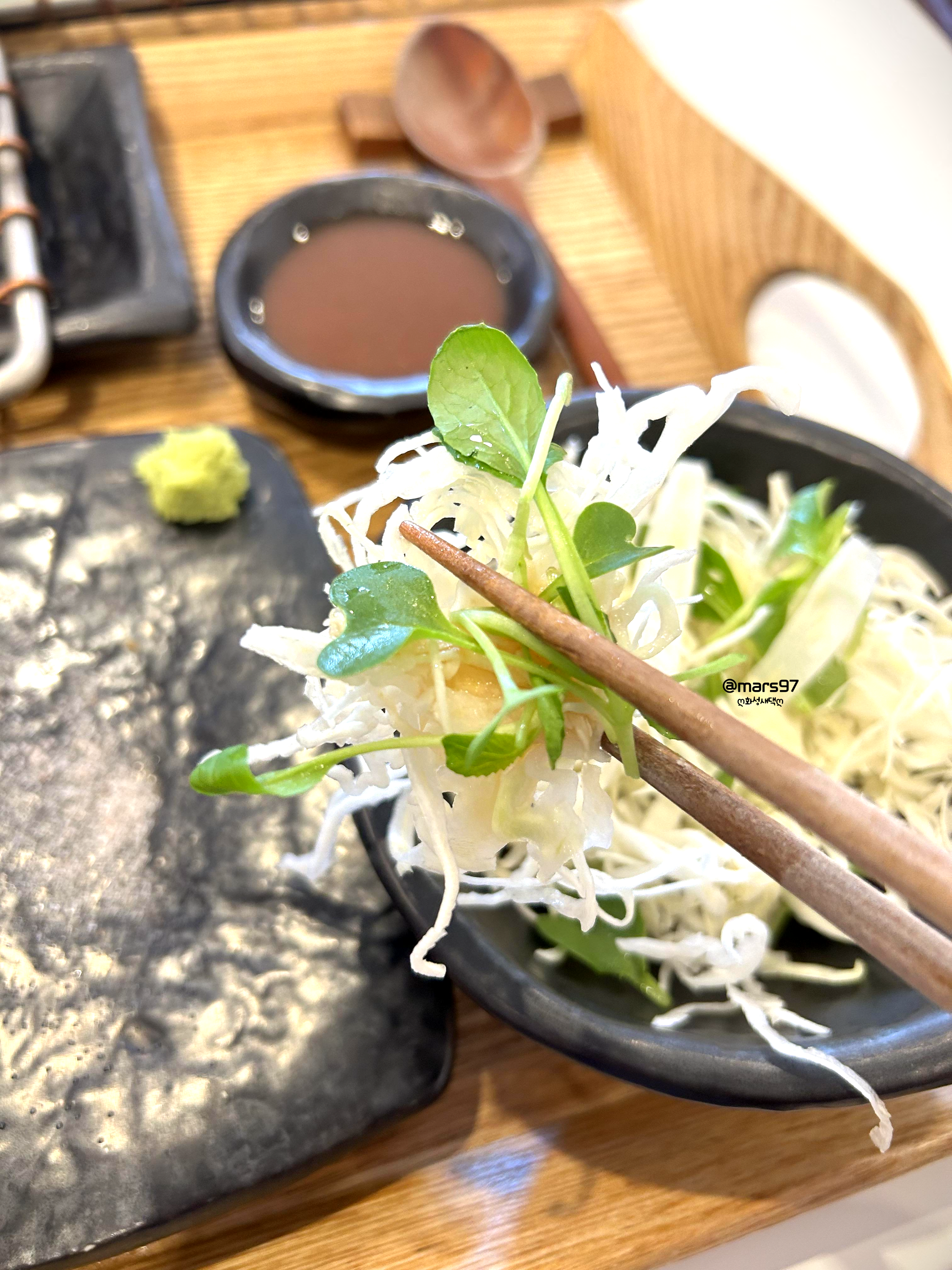 밥과 샐러드, 소금과 고추냉이, 돈까스 소스,