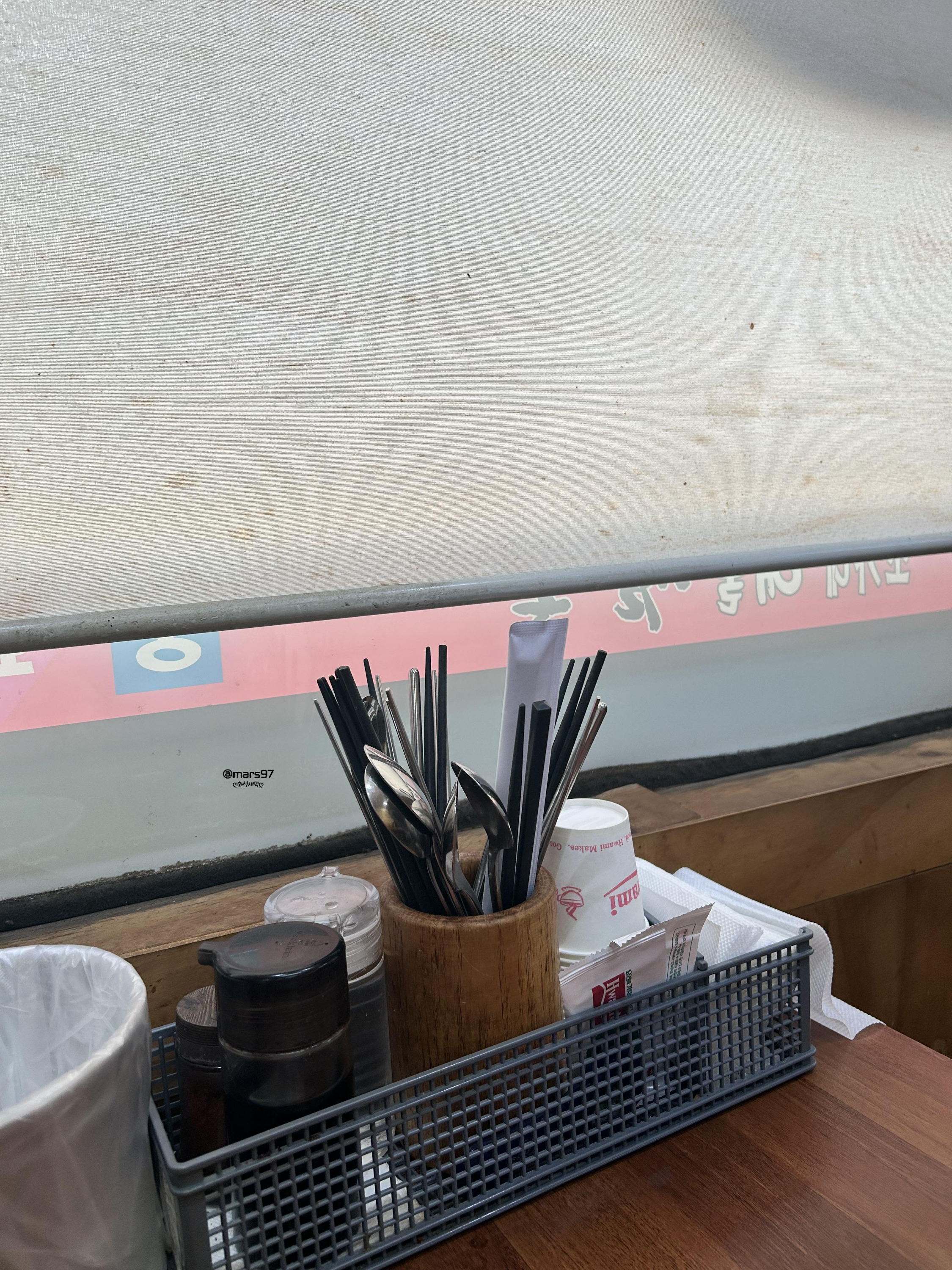 테이블 한쪽에는 간장과 식초, 고춧가루와 종이컵,