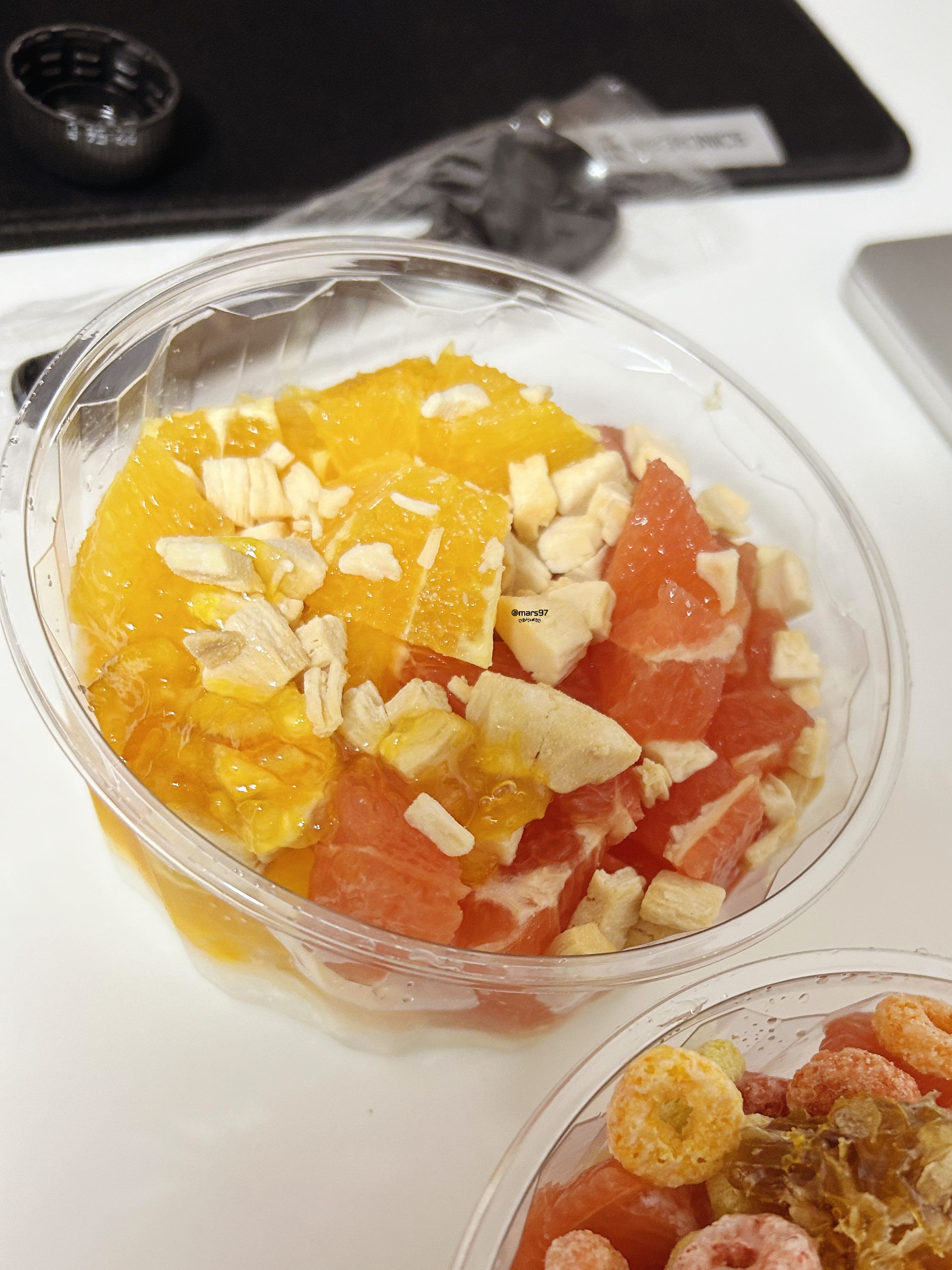 요거트 아이스크림과 함께 코코넛과 자몽, 그리고 오렌지가 올라가 있어요