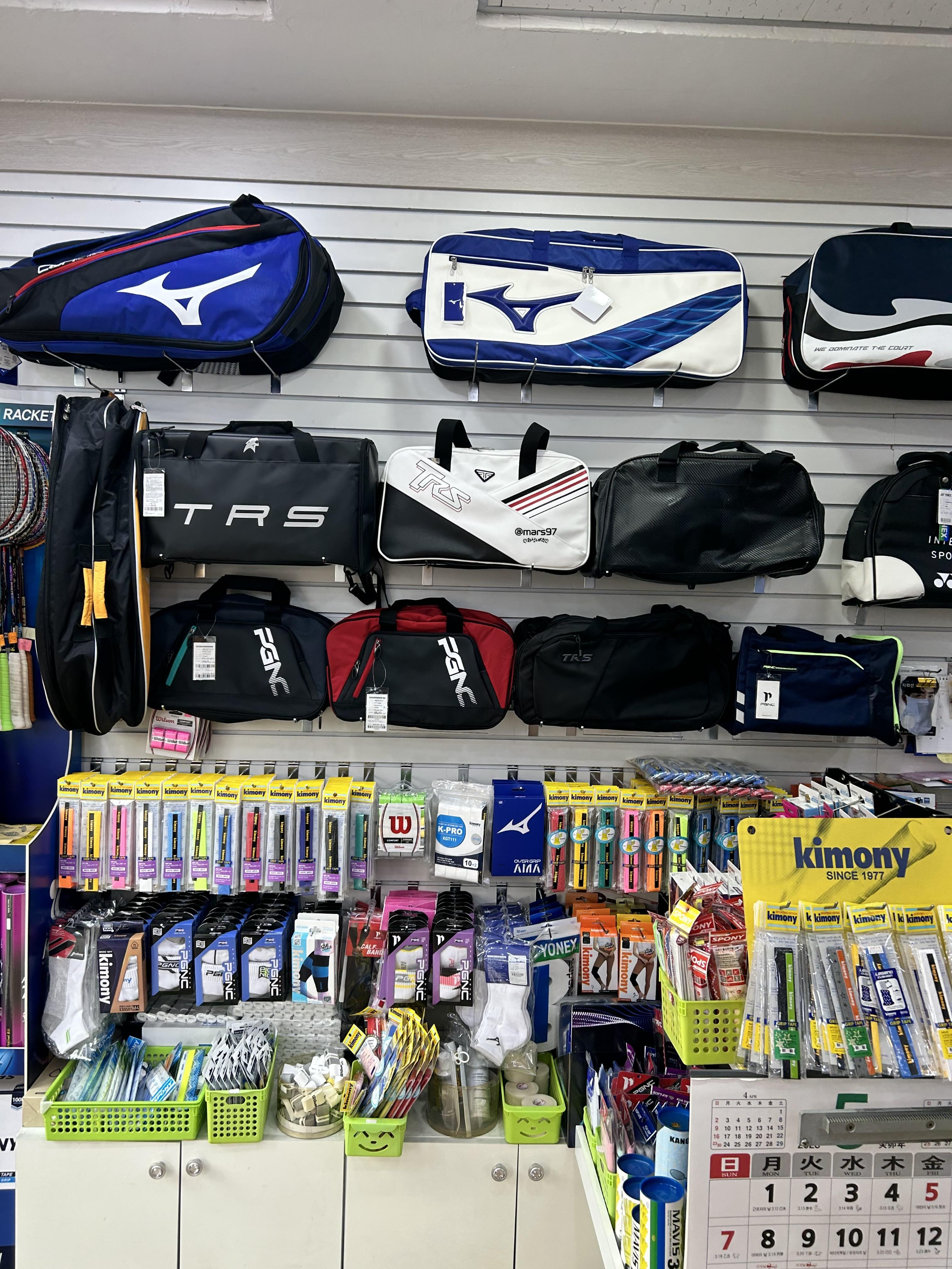 신발 이외에도 배드민턴 라켓과 가방, 양말, 보호대 등등