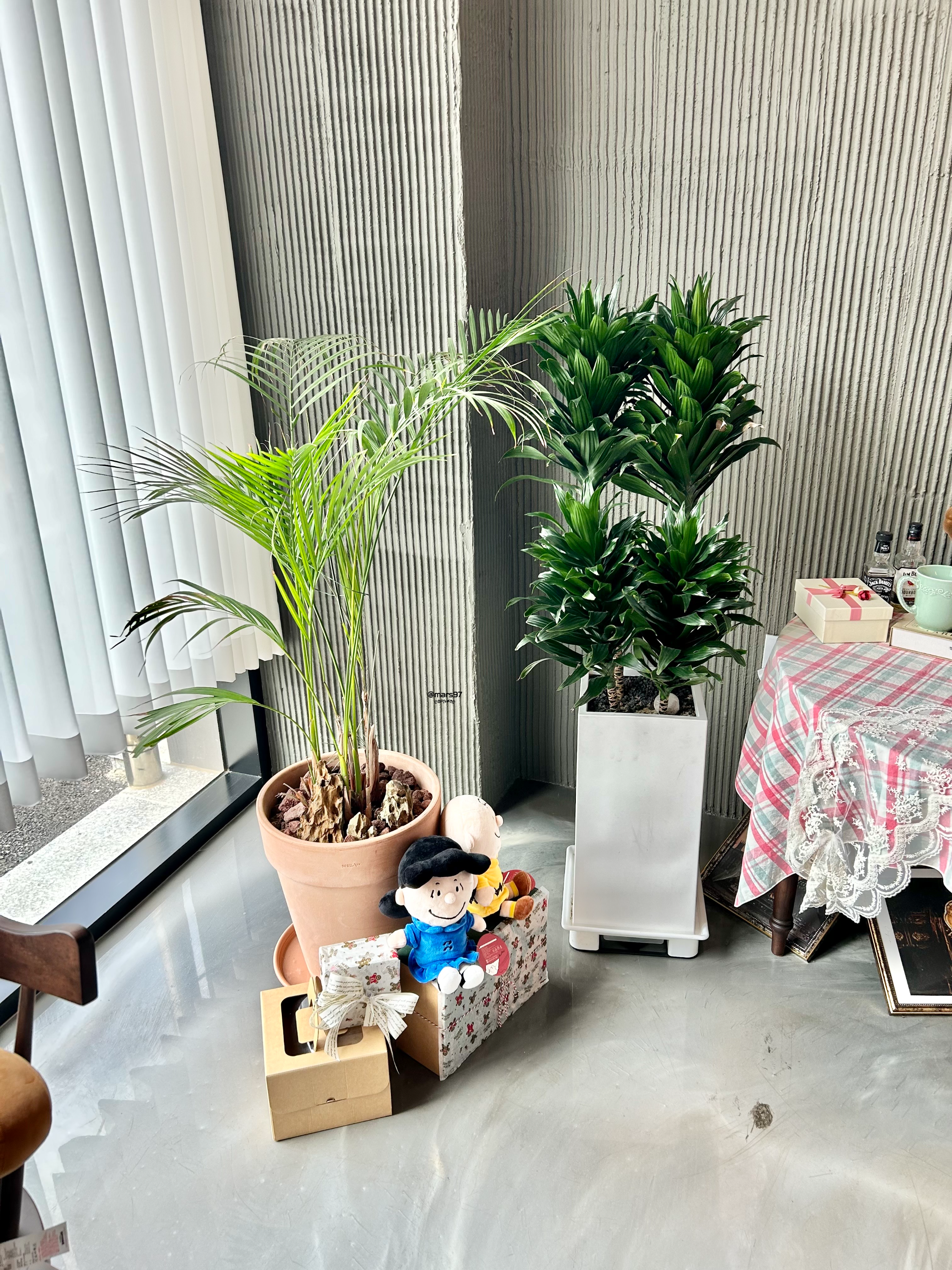 우드 느낌에 중간중간 있는 큰 식물이 조화로운 인테리어예요