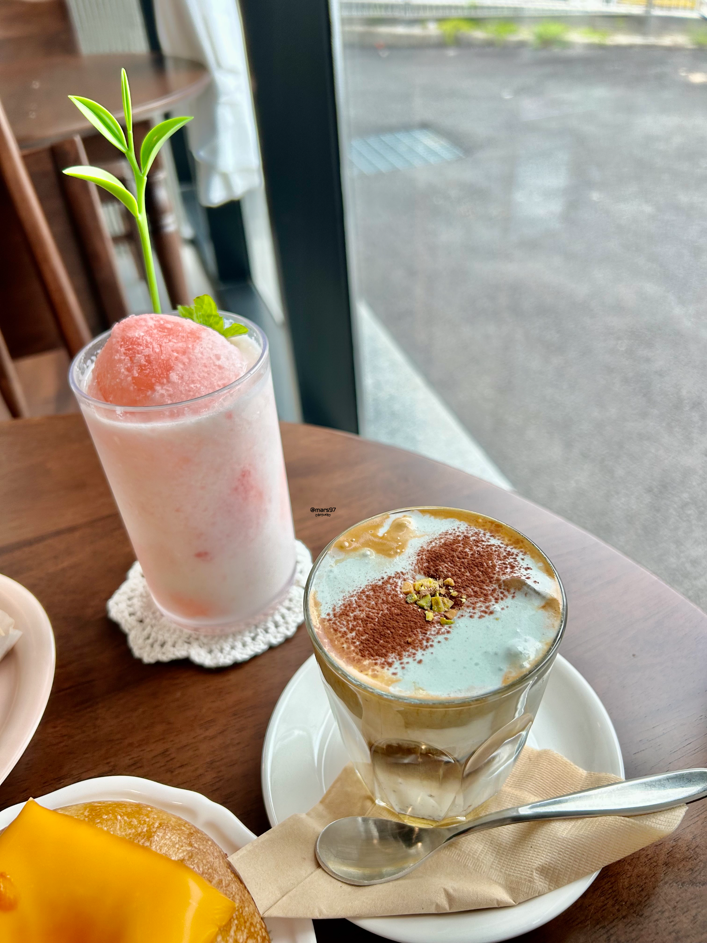 복숭아 스무디와 피스타치오 크림 라떼