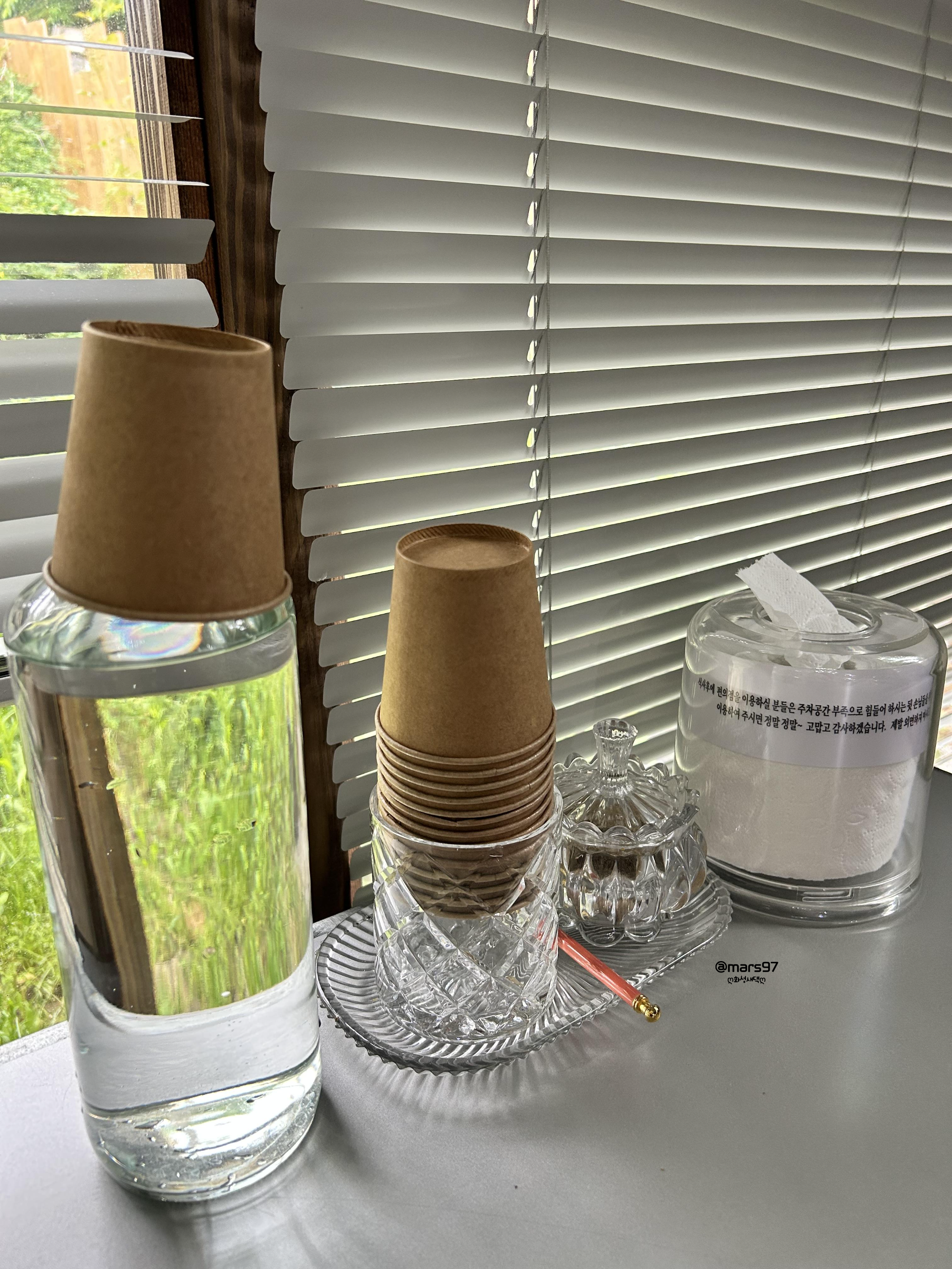 테이블 한쪽에는 물과 컵,
