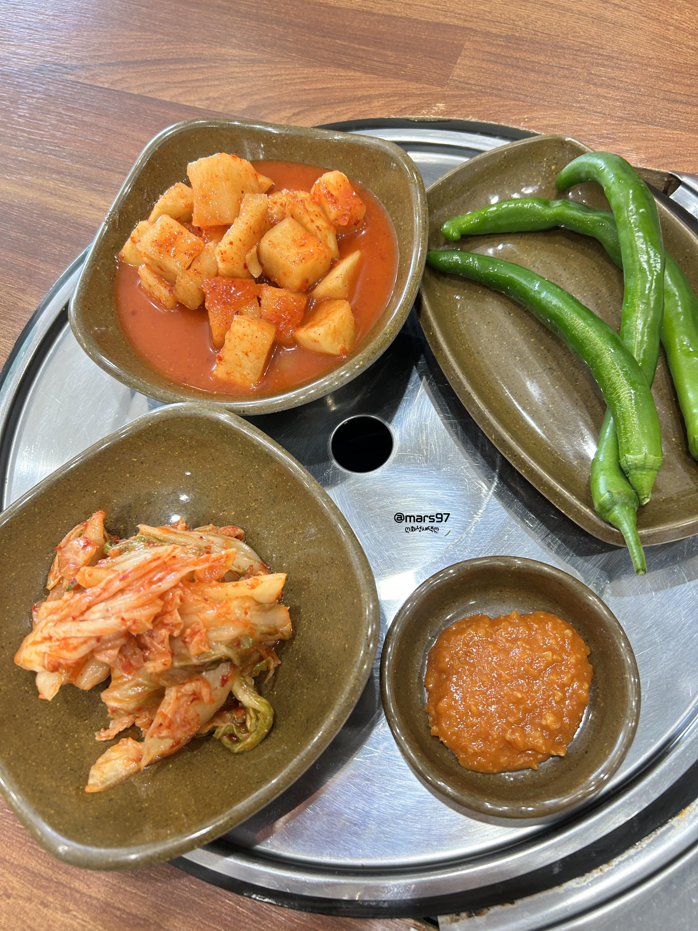 기본 반찬은 깍두기와 배추김치, 고추, 그리고 쌈장이 나와요