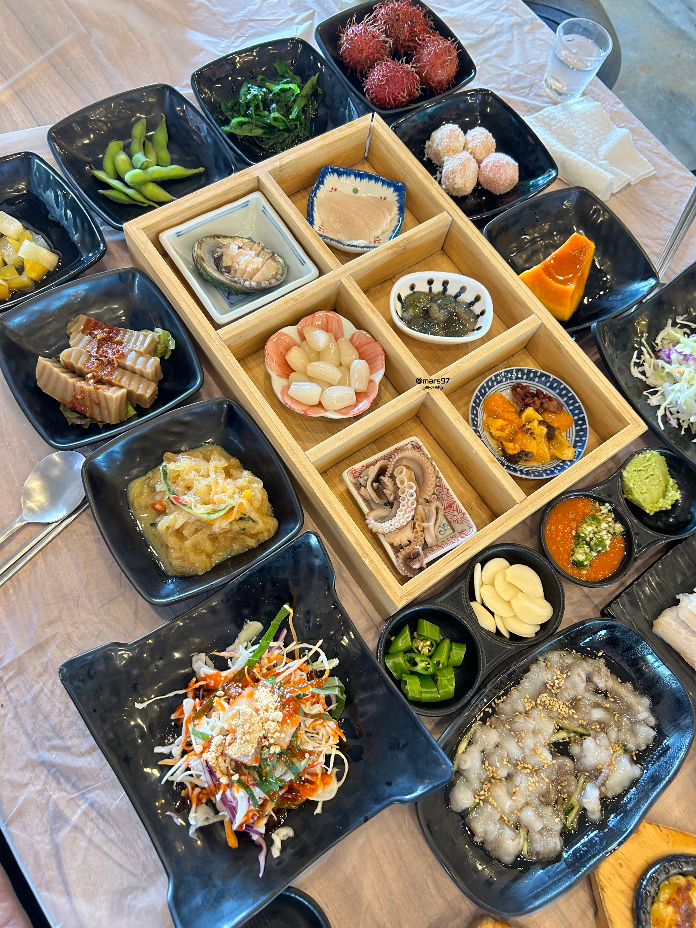전복 회, 관자, 산낙지, 회 초무침, 떡, 과일, 도토리묵,