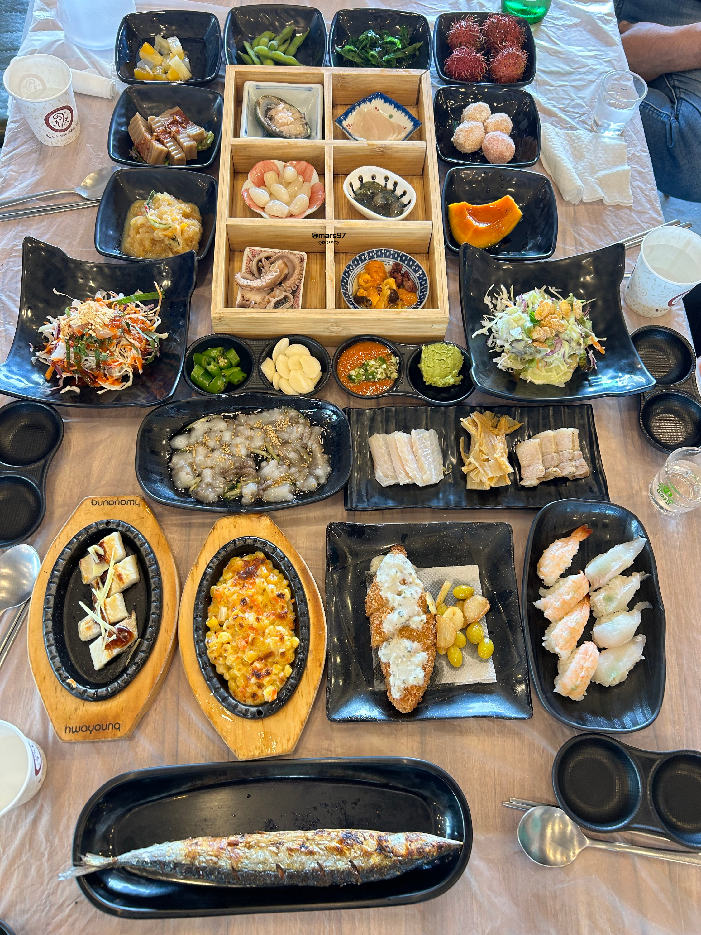 초밥, 장어구이, 꽁치, 간장새우, 김치, 콩나물 등등