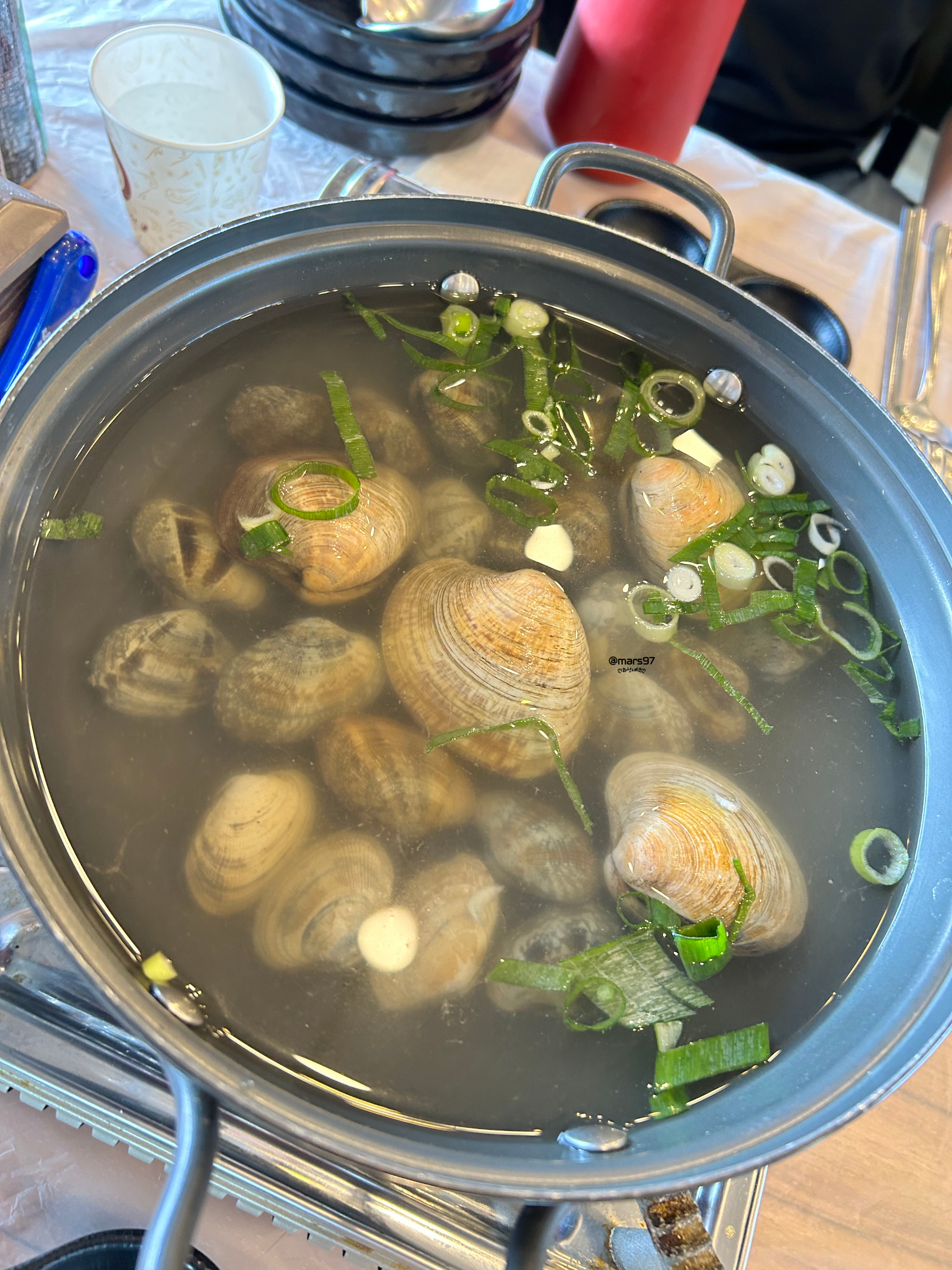 시원 칼칼한 국물에 큼지막한 조개가 많이 들어 있어요