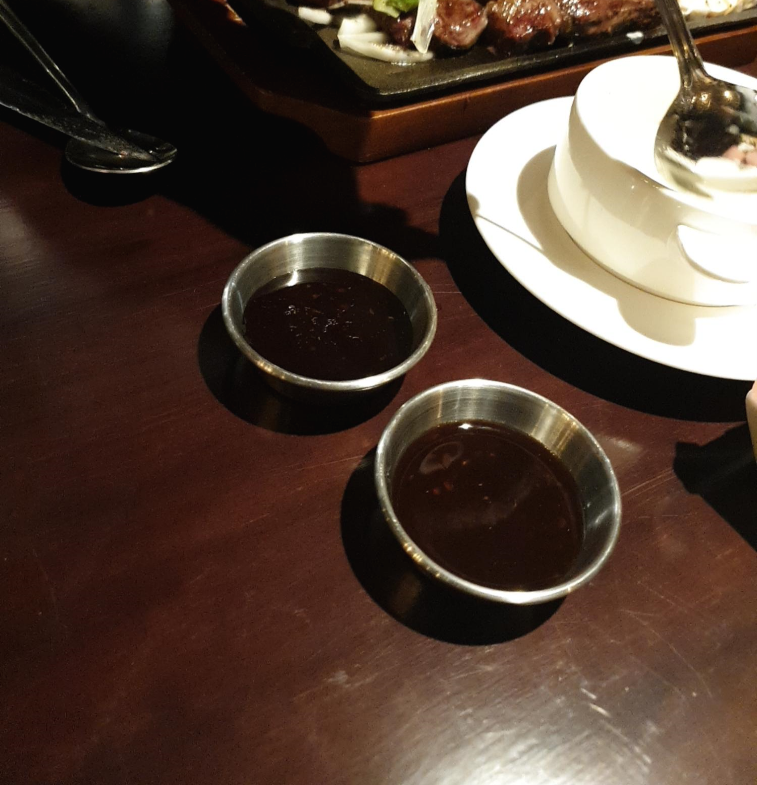 왼쪽부터 스테이크 기본소스, 후추와 소금, 매운소스 그리고 고추냉이 까지