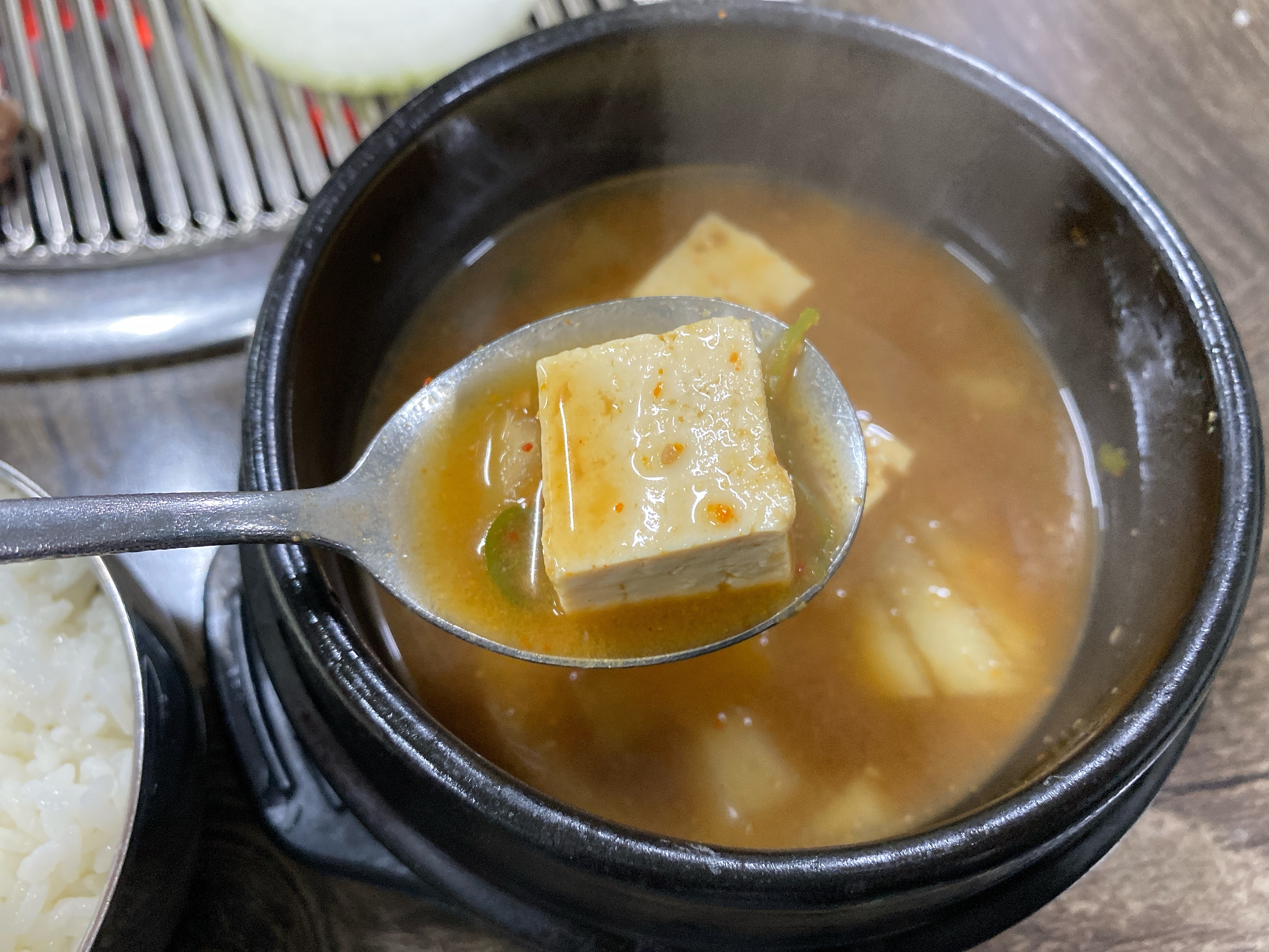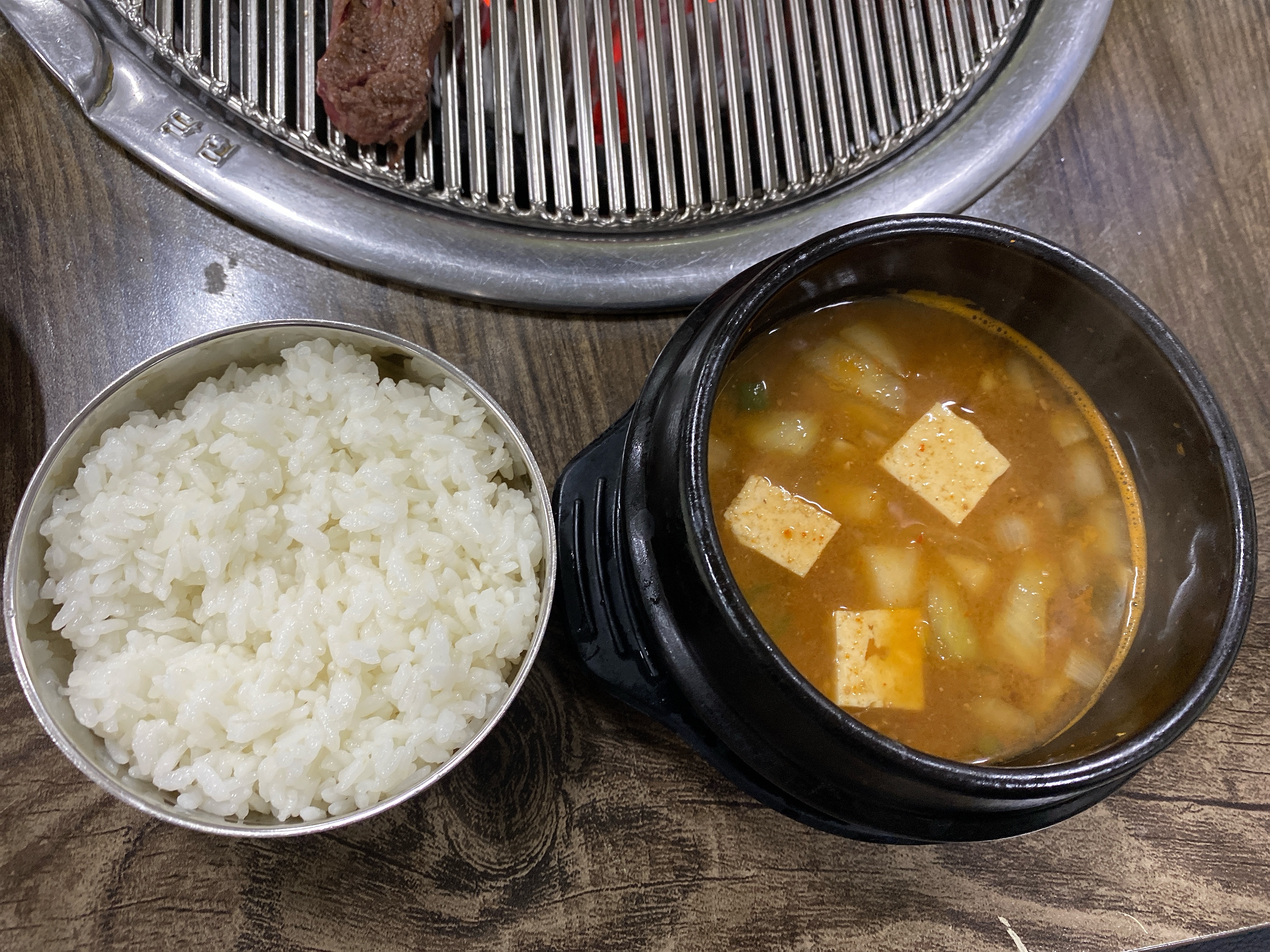 된장찌개에 밥 비벼서 남편님이 맛있게 구워준 꽃등심 올려 먹으면