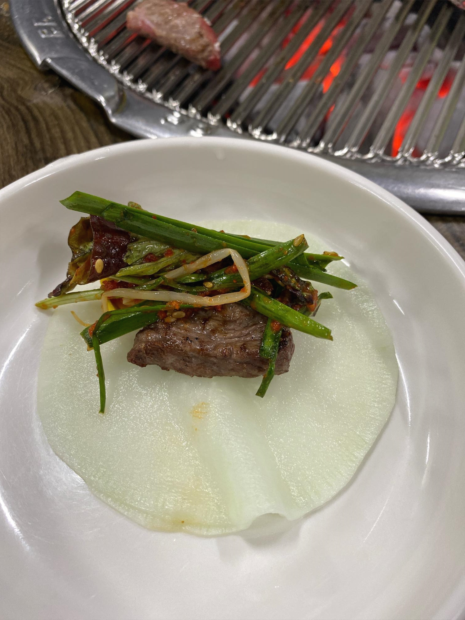 잘 익은 생삼겹살을 소금에 찍어먹고 쌈장과 함께 무쌈에 싸먹었어요
